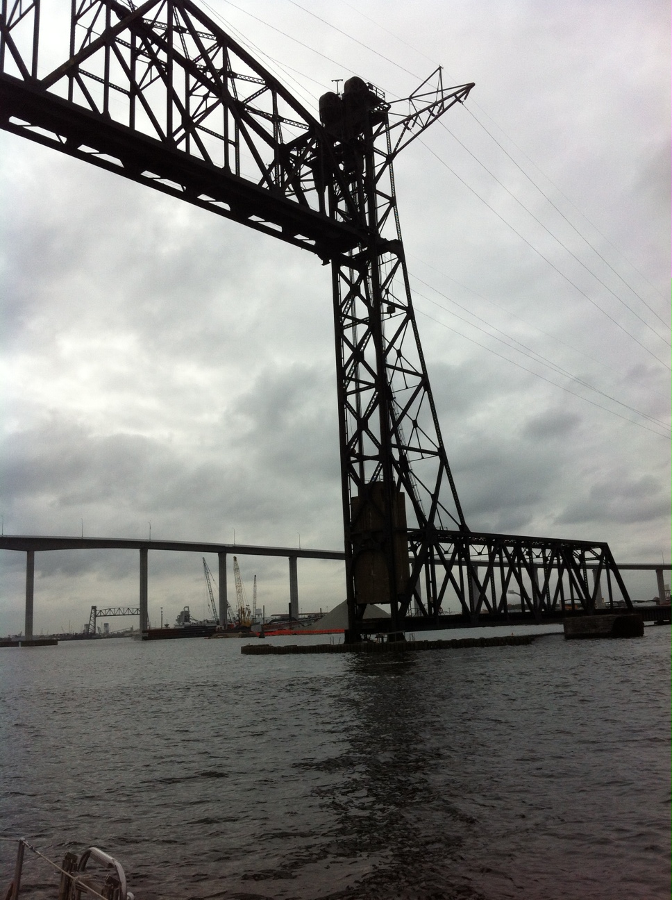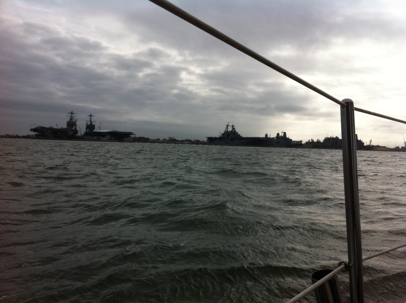 We crossed Hampton roads this morning, open to the ocean and turbulent. We swung by Norfolk and its naval docks. War ships hang in there, in a zone surrounded by markers and reinforced by helicopters and boats with flashing lights. We are keeping snug to the red rigth markers at the side of the deep channel, as opposite them as we can. Flashing lights on cars are no good, and we guess the same rule applies to boats. I wonder, “How deep is the channel?” Dickie looks at his depth meter that prefers the “off” position to the “on” and we still can’t figure out why, “60 feet.” He muses, “A bit much for even such big ships. Hmm… might be for submarines…” Sparkle in his eyes, “Hey, there might be a submarine below us right now!” Of course, we milk the subject a while—what if we got a message on the radio as we did from a tug boat 2 days ago, “sailboat Peregrine, you are 20 feet from us, and need to move to starboard,” and we’d look around seeing nothing until a huge dark form would emerge from the depth bla bla bla.