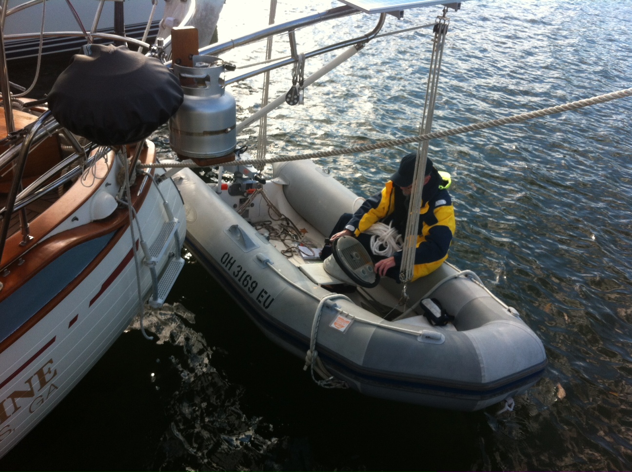 Marie-Laure asked when we were leaving. Since we changed some parts on the engine, we are to use it 10 hours to make sure it works. It means 2 days of boating around the Chesapeake Bay. There is a gale today, and we can’t leave port. So, if all goes well, we may start the trip on Tuesday. Meanwhile, we are busy. Today we did: 2 weeks worth of laundry, starting the stove, inflating and testing the dinghy (pictured), and I can now fix dysfunctional canvas zippers, aside from cleaning and lubricating them. There is a trick I’d be glad to share with anyone having trouble opening a zipper (closing is easier).
