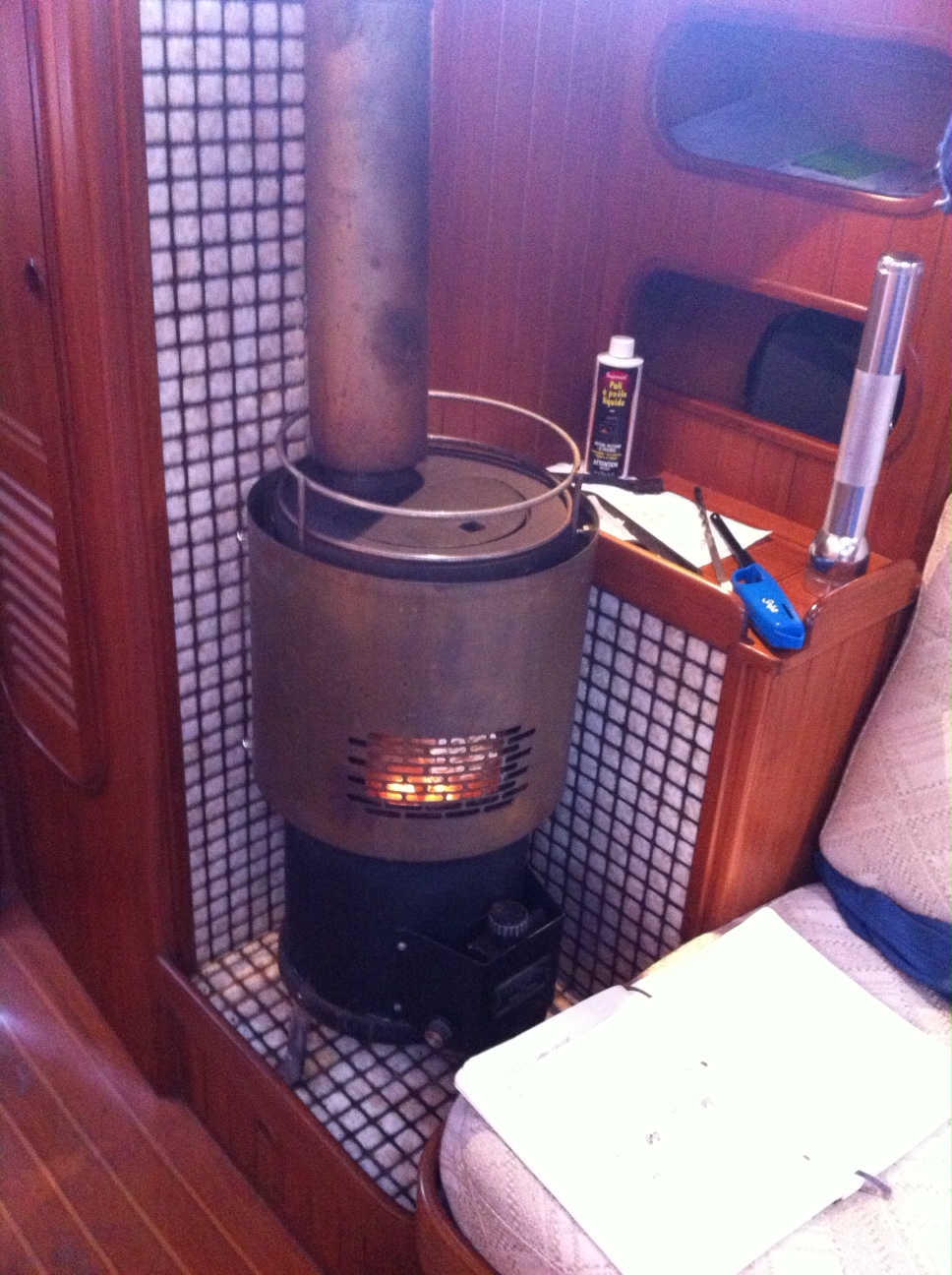 Peregrine has a very cute heater. Today finally, after many unfruitful tries, some help that did not help and ordering new parts, Dickie has been able to turn it on. We now have a toasty 55 degrees in the cabin. Yesterday, I brushed the rust on the iron part (on top with the trap), and polished it with black polish, much in a Laura Ingalls manner. Can’t wait to get to the copper body. Nowadays, heaters are made out of stainless steel. The radiant heat is wonderful: it feels good, especially with high winds going on outside, and also it reminds me of Descartes who came up with his cogito while “sitting in a stove” (yes, “in” a stove, you read it right).