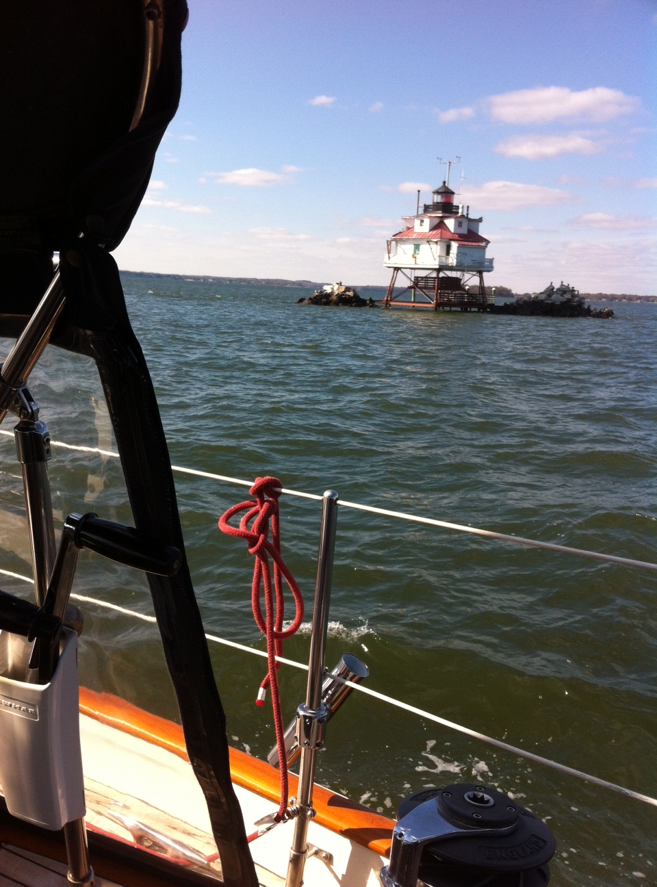 We had a shake-down sail yesterday. Well, rather a motoring, and the good news is, the motor seems to work. We went to Thomas Point Shoal light, pictured above. The light structure is a bit surprising–isn’t a light house normally a tower with thick walls, bunch of steps and no windows but at the top? The answer is no. Weathering Sandy in that light house must have been something.