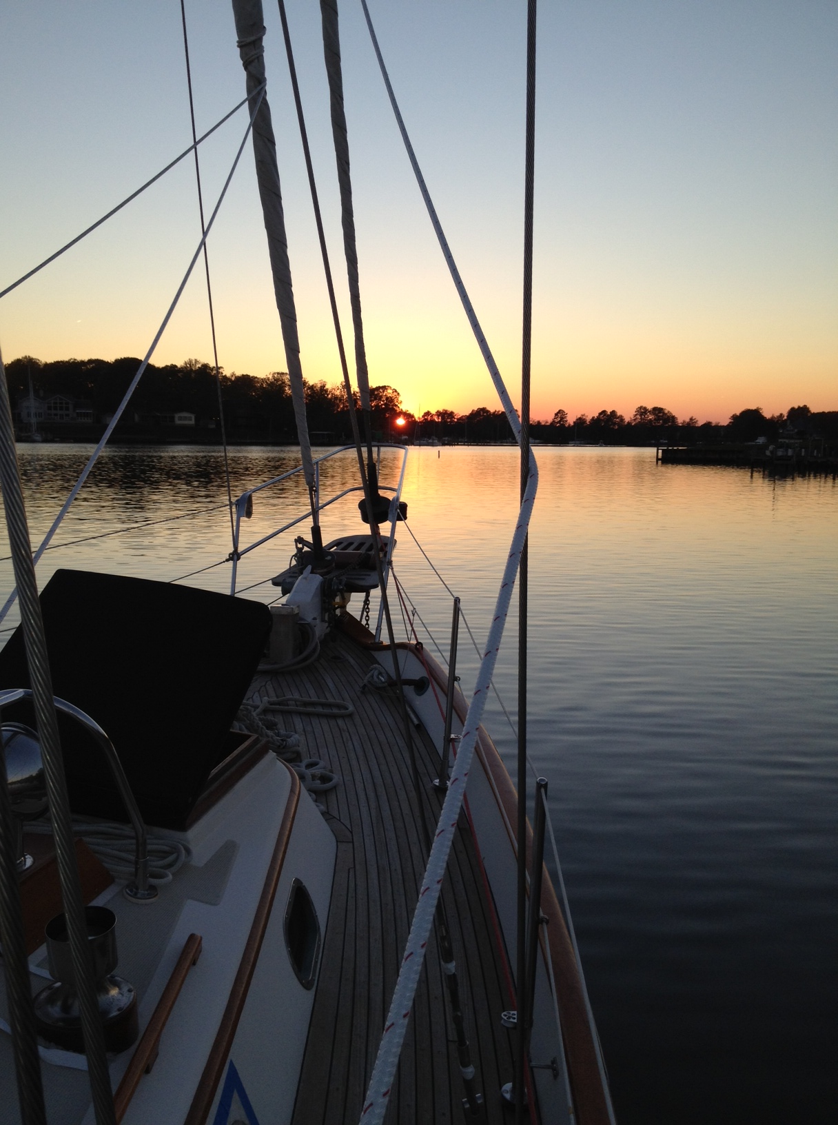 We anchored at Solomons island last night (picture by Dickie, and yes, we left Annapolis). When you anchor, you choose a spot and throw your anchor: water does not belong to people. I’m appreciating more and more the sense of freedom water provides. Also, bodies of water do not encourage convergence of people like roads do, and our creek was oh so pretty and peaceful. Very peaceful in fact: by leaving the dock we lost our AC electric connection to the world, and kept our electronic usage to a minimum. I made Shrimp fra Diavolo while Dickie changed the oil filter, and we went to sleep at 8:00. We got up with the sun and are now on our way to Reedville, our next anchorage.